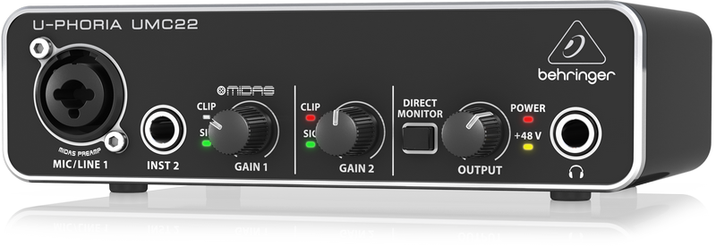 The amazing UMC22 ultra-compact 2 x 2, 48 kHz USB audio interface allows you to record the perfect vocal or instrument tracks directly to your computer, thanks the MIDAS-designed Mic Preamp with +48 Volt phantom power for condenser microphones – and studio-grade 48 kHz converter for superb sound quality. Whether you’re a singer-songwriter, producer on the go, or just need a rocksolid interface for running backing tracks at the gig, the ultra-dependable U-PHORIA UMC22 will help you shine in the digital domain.